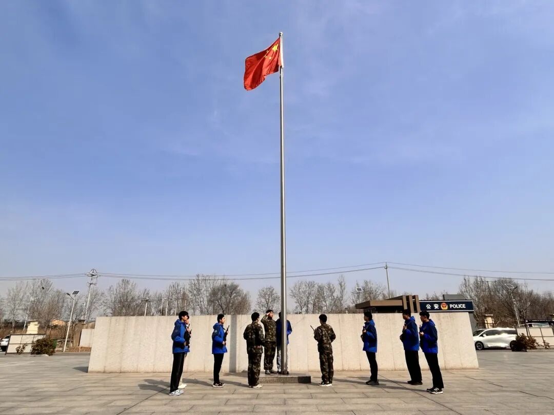 伴随着雄壮的国歌声,升旗手迎风振臂,五星红旗冉冉升起,全体师生肃立注目。