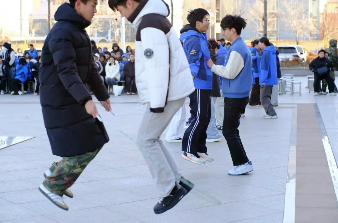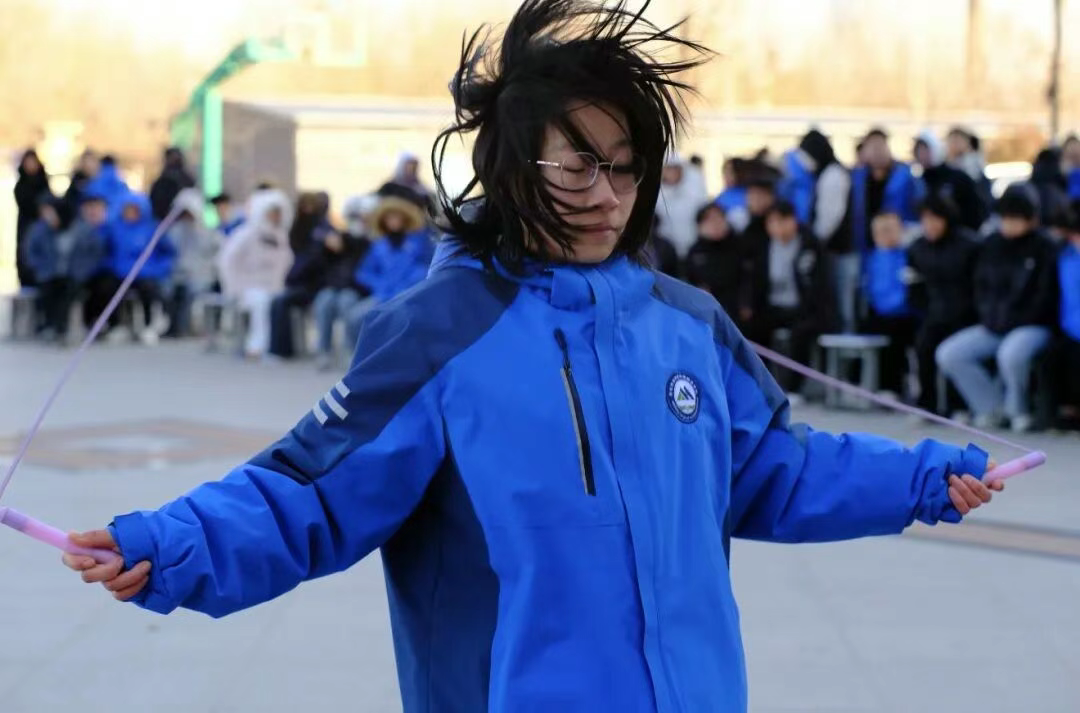 “单人单摇跳”比赛,学生们专注地挑战自我极限,跳绳击打地面的声音如鼓点般密集,引来阵阵喝彩。